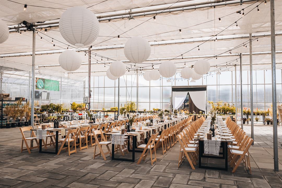 We are proud to offer over 16,000 square feet of indoor and outdoor spaces to best suit your event needs. Our greenhouse is equipped with retractable shade curtains and roofs that can open and close on command, ample power, and a natural gas backup generator. Indoor spaces are climate-controlled, and ample parking is available to accommodate events of up to 150 guests.