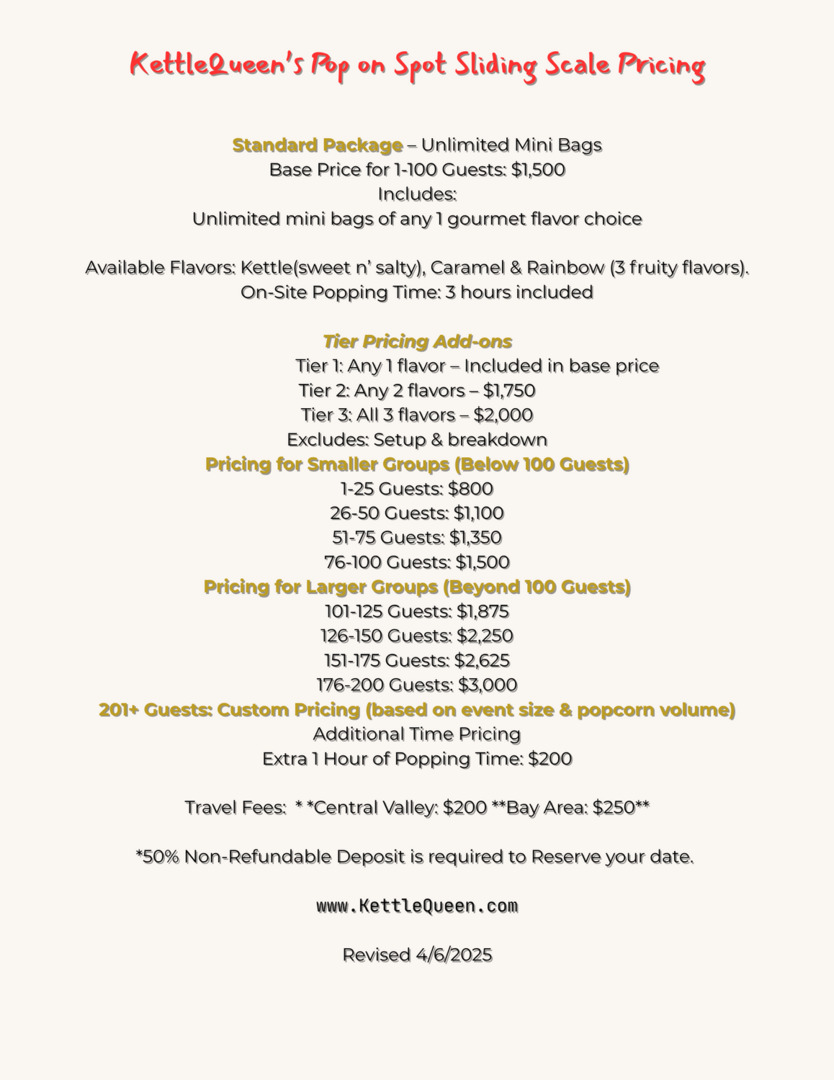 Spots fill up quickly! Reach out NOW to guarantee fresh-popped kettle corn at your event!
