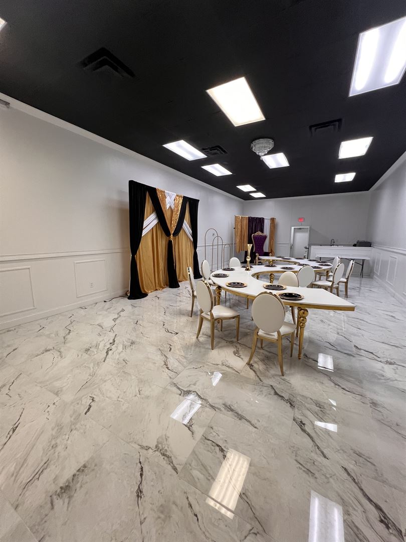 Immerse yourselves in an atmosphere of unparalleled elegance at our meticulously crafted venue. From the moment you step inside, you'll be captivated by the exquisite details, including gleaming porcelain floors that reflect the warm, inviting light, a stunning chandelier that casts a mesmerizing glow, and sophisticated crown molding that accentuates every wall, all contributing to a timeless sense of luxury. Charming wainscoting adds a touch of classic charm, further enhancing the ambiance. We've thoughtfully designed every aspect of the space with your comfort and satisfaction in mind, featuring a perfectly regulated temperature, a very convenient and well-equipped kitchenette for effortless refreshment service, and a beautiful, thoughtfully curated décor that enhances the overall ambiance, making every event truly memorable. A spacious and inviting foyer provides ample opportunities for creative entrance decorating ideas, perfectly setting the stage for memorable events and leaving a lasting impression on your guests.