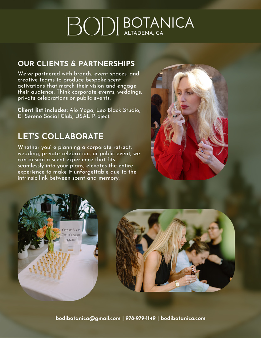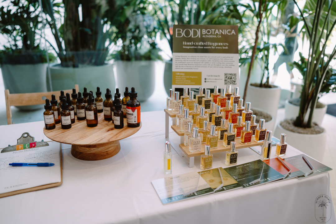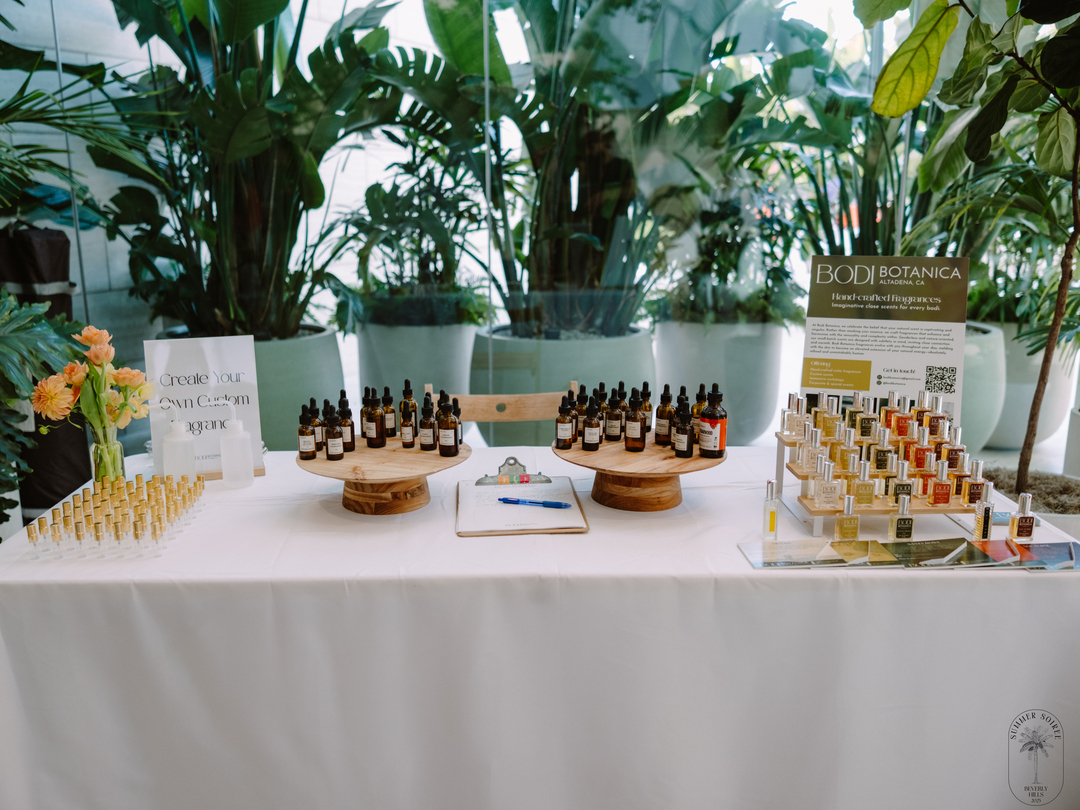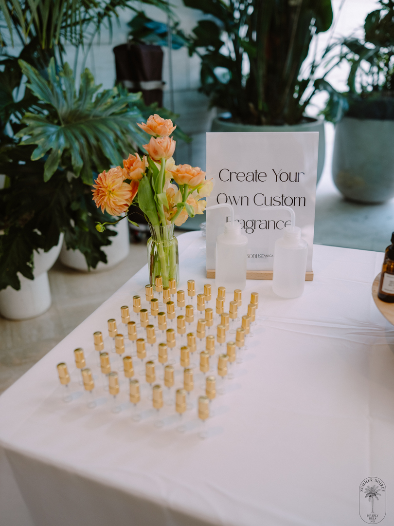 Bodi Botanica is a Los Angeles-based fragrance studio that creates immersive scent experiences for weddings, corporate events, and brand activations. Guests design and take home their own custom fragrance — it’s interactive, beautiful, and memorable. Custom scent creation can be tailored to fit any size event.