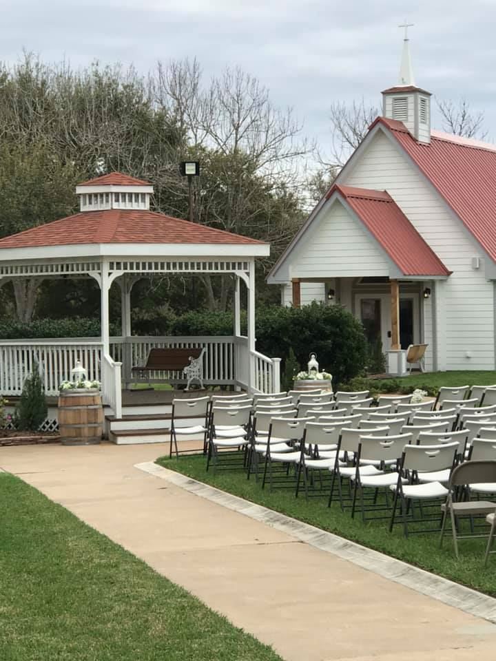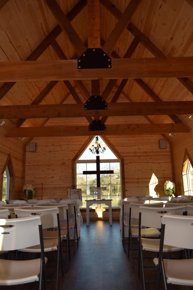 The Hall has all new flooring. A 55" television is the centerpiece of our new media center to enhance your guest's experience with videos and picture DVDs. We have new sound system throughout the hall and outside for your DJ or your own music with Bluetooth. We can accommodate your outdoor or indoor wedding with guest seating of 100 plus. Our outdoor patio now has enclosures making it usable rain or shine and can seat an additional 50 plus with room for dancing. We are proud to announce that Legacy Chapel is now open for Weddings and more. The Chapel is modeled after an old country church with seating for 75 plus for your wedding ceremony, or other celebrations. It was dedicated in January 2019. We now have closed circuit TV in the hall for your overflow Guest to watch weddings in the Chapel.