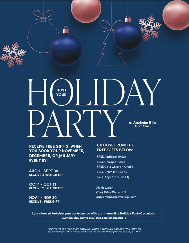Whether you're planning a wedding, award banquet, anniversary, birthday, quinceañera, celebration of life, debut, engagement party, corporate retreat, shower, reunion, mitzvah, or company holiday celebration, the Anaheim Hills Golf Clubhouse has everything you need!