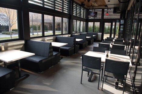 The patio is enclosed with retractable glass walls allowing it to transition effortlessly between an open-air terrace in warmer months and a cozy, insulated venue in colder seasons. The natural stone floors, bamboo ceilings, and custom Asian-inspired lantern lighting echo the upscale modern Asian aesthetic that defines P.F. Chang's interiors.