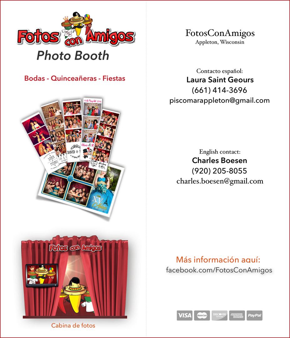Photo booth geared toward the Hispanic, Spanish speaking market. The photo booth is wheelchair accessible. The footprint is six feet by eight feet. Every guest receives a complimentary photo strip. There is no limit of photos. A memory book is included.