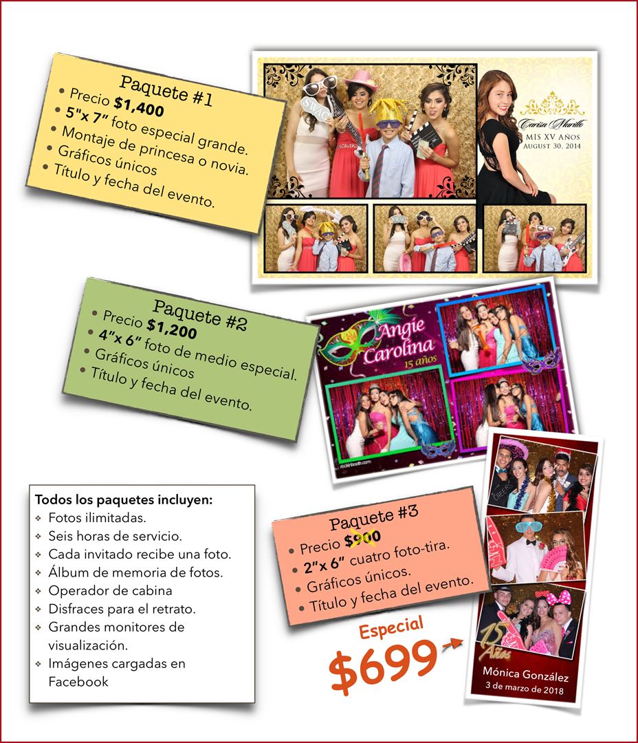 Cabina de fotos orientado al mercado hispano de habla hispana. El fotomatón es accesible para sillas de ruedas. La huella es de seis pies por ocho pies. Cada huésped recibe una tira de fotos complementaria. No hay limite de fotos Un libro de memoria está incluido.