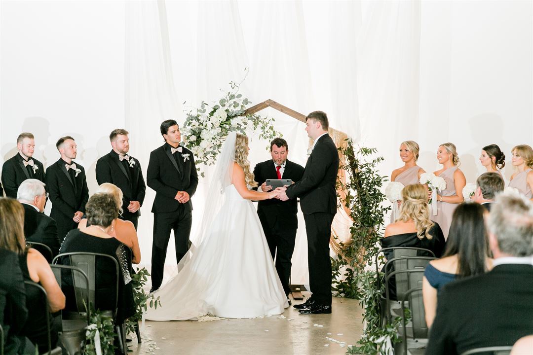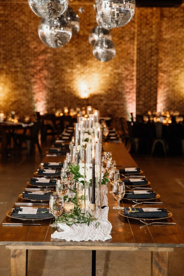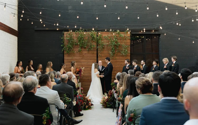 The venue is complete with stunning industrial farmhouse tables, beautiful metal tolix chairs, highly styled lounge furniture and existing ambient decor surrounded by interior rich brick walls and iron & glass doors. The entrance is so unique and unlike anything you will ever find. The outdoor space has a clean, modern, industrial feel but is softened by the massive trees that cover the exterior space. you will be amazed by what exists behind the unsuspecting wooden gates…