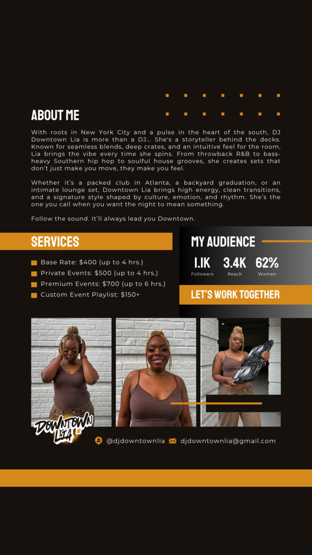 DJ Downtown Lia is an open-format female DJ based in Atlanta, bringing the perfect mix of R&B, Hip-Hop, Caribbean, Afrobeat, House, Dance, Pop, Country, Throwbacks, and all your favorite hits! Whether you’re planning a private event, wedding, or nightlife party, she knows how to set the right vibe and keep the crowd moving.
