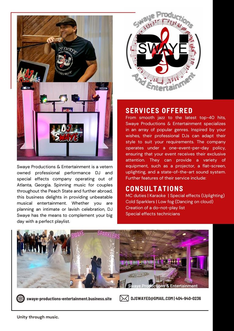 Swaye Productions & Entertainment offers audio-visual embellishments for weddings, based in Atlanta, GA. Led by a DJ with a wealth of event experience, you can expect your special day to be invigorated with one-of-a-kind energy. Step up your reception with a custom playlist that will have your party on its feet all night long.