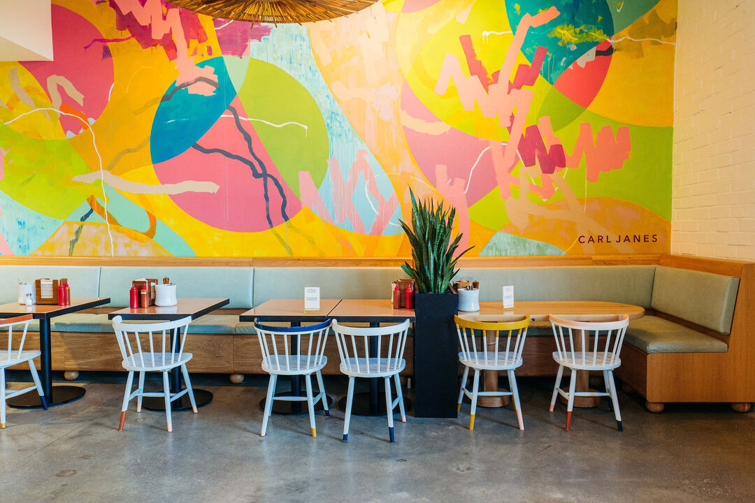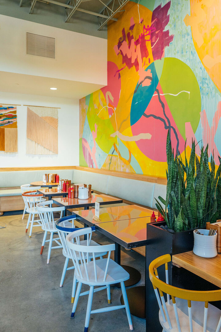 Our space features floor-to-ceiling windows, soaring ceilings, and an eye-catching mural wall that creates a colorful backdrop for any occasion. The open layout, natural light, and mix of modern + cozy seating make it an ideal setting for bridal showers, birthday parties, happy hours, corporate events, workshops, and pop-ups.