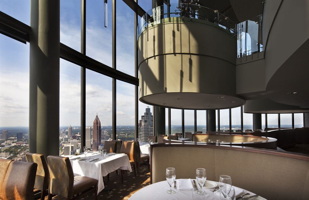 From the time you step on to the glass elevator and ride to the top of this Atlanta skyscraper, you will be amazed beyond belief. This is not the place for people with a fear of heights! When you step off the elevator, you are in a 360 degree space, with windows boasting the best view in Atlanta. During the day time it's beautiful, but at night, looking out at the city lights, it's breath taking. The decor is simple and dark. It doesn't take away from the view. The food is average. Personally, I think this place is much better for cocktails and visiting with friends. But as the room rotates, and you get to experience all of Atlanta's beauty, the food doesn't seem so important. This is a great place for a romantic get together or for showing off this beautiful city's skylines to your out of town guests.
