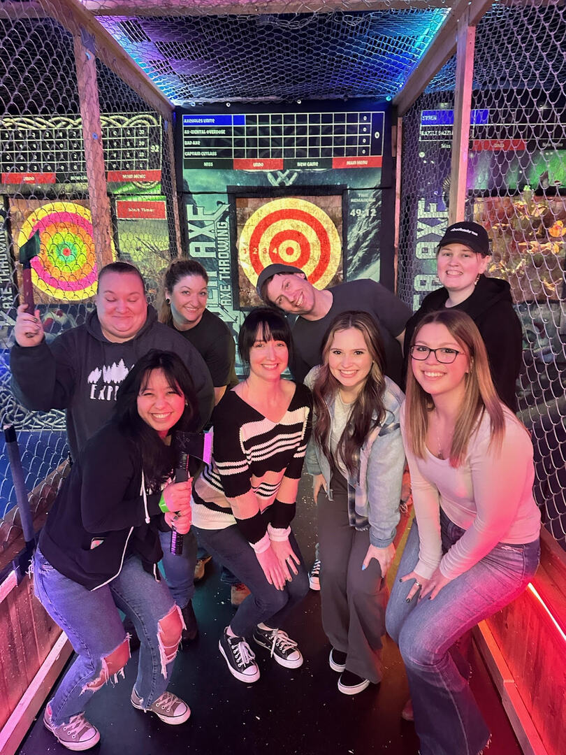 Our clean, high-energy indoor space is perfect for birthdays, company parties, date nights, and group outings. We provide professional throwing lanes, trained axe coaches, and a stocked bar with beer, seltzers, and soft drinks. Ages 8+ welcome to throw (with adult supervision).