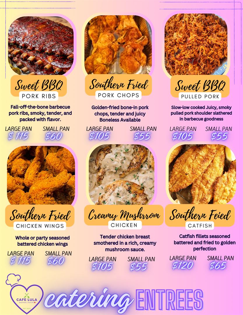 So, whether you're planning a business luncheon, a family gathering, or a special event, let Cafe Lula be your trusted catering partner. Experience the warmth and flavor of southern comfort cuisine, served with a smile and an affordable price tag. Contact us today to discuss your catering needs and let us make your event a delicious success.