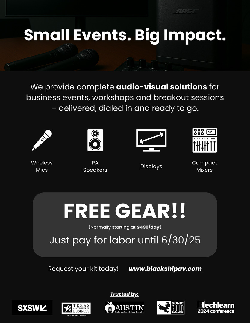 BlackShip AV provides full-service audio visual rentals for corporate, nonprofit, and government events in Austin. Our all-in-one AV kits include Bose speakers, wireless mics, 55” displays, and everything needed for a smooth, professional setup — fully delivered, installed, and picked up by our team.