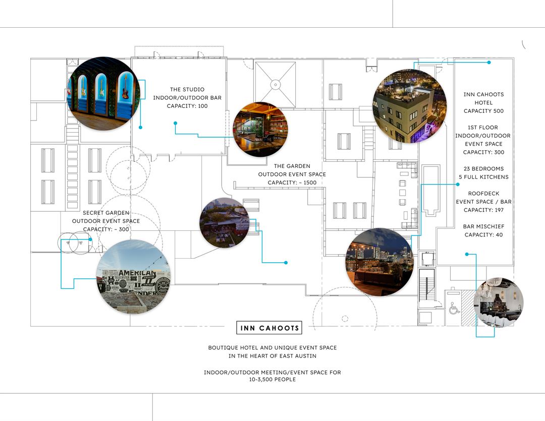 Inn Cahoots is a four-story boutique hotel and event venue on East 6th Street that features five spacious and versatile condo-style suites (23 hotel rooms), a sprawling rooftop deck overlooking Downtown Austin, and more than 32,000 sq. ft. of convertible indoor / outdoor gathering space. From corporate retreats to bachelorette celebrations to networking events, we offer one-of-a-kind accommodations and venue space for any occasion.