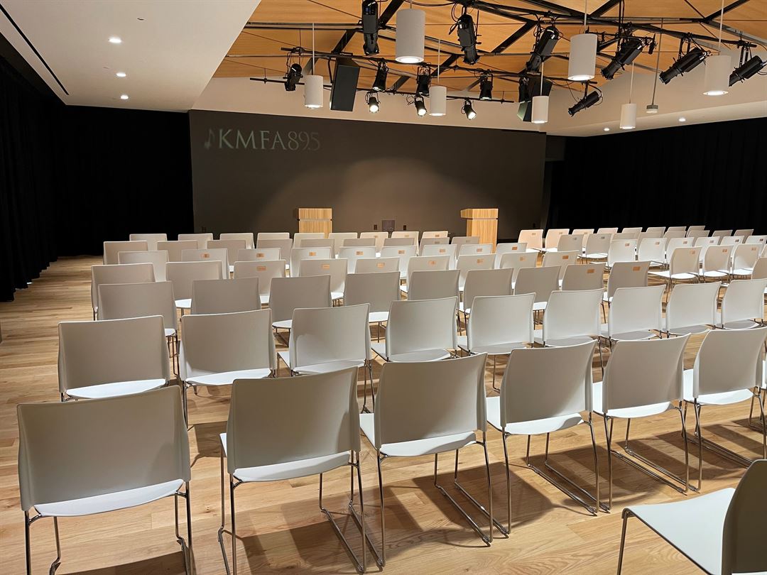 We recently had our wedding on 7/4/23 at KMFA! This is a new venue and the headquarters of KMFA, the classical music station of Austin, so you’d be helping a non-profit too if you use it. They have a wonderful modern space only 4 min driving distance from the east 6th entertainment district. The building has a downstairs lobby for waiting guests that we staged with our guest book and champagne. The upstairs has a lobby/bar area for cocktail hour, a sound garden room with fun instruments-turned-art to play with, a windowed conference room, terrace, and a large studio for the reception with really great lighting effects that you can project. We were going to have our ceremony on the terrace but it was so hot we moved it to the conference room and bought a drape and stand kit for the backdrop. We donated that kit to the venue for future events/couples to use if they choose KMFA. The venue manager Stacey and her assistant Barbette were super helpful and also helped with timing of different wedding activities and there was no need for an outside day-of coordinator. They kept it running! We also had use of their 6 round tables, 6 rectangle tables, and six cocktail tables. The cocktail tables came with linens. I bought black linens for the rest and donated them to KMFA for future events/couples to be able to use if they choose KMFA. We had the venue for I think 12 hours for 3000. We then paid an optional $240 fee to have security there. I would highly recommend this venue! We have zero regrets at all and it is a great way to get an urban wedding at an affordable price with helpful and detail oriented staff! BTW they allow you to bring in your own caterers! If they aren’t on their preferred vendors list, they will need to do a walk through. If you don’t want to do that though, they had a few very affordable preferred vendors on their list :)