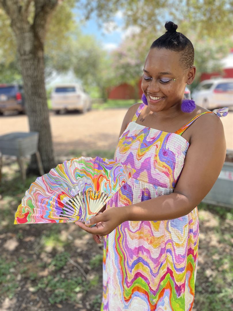 1. A single marbling station where event attendees can step up one by one and and create their own marbled masterpiece to take home. There are many options for objects to marble, including hand fans, silk, and more.