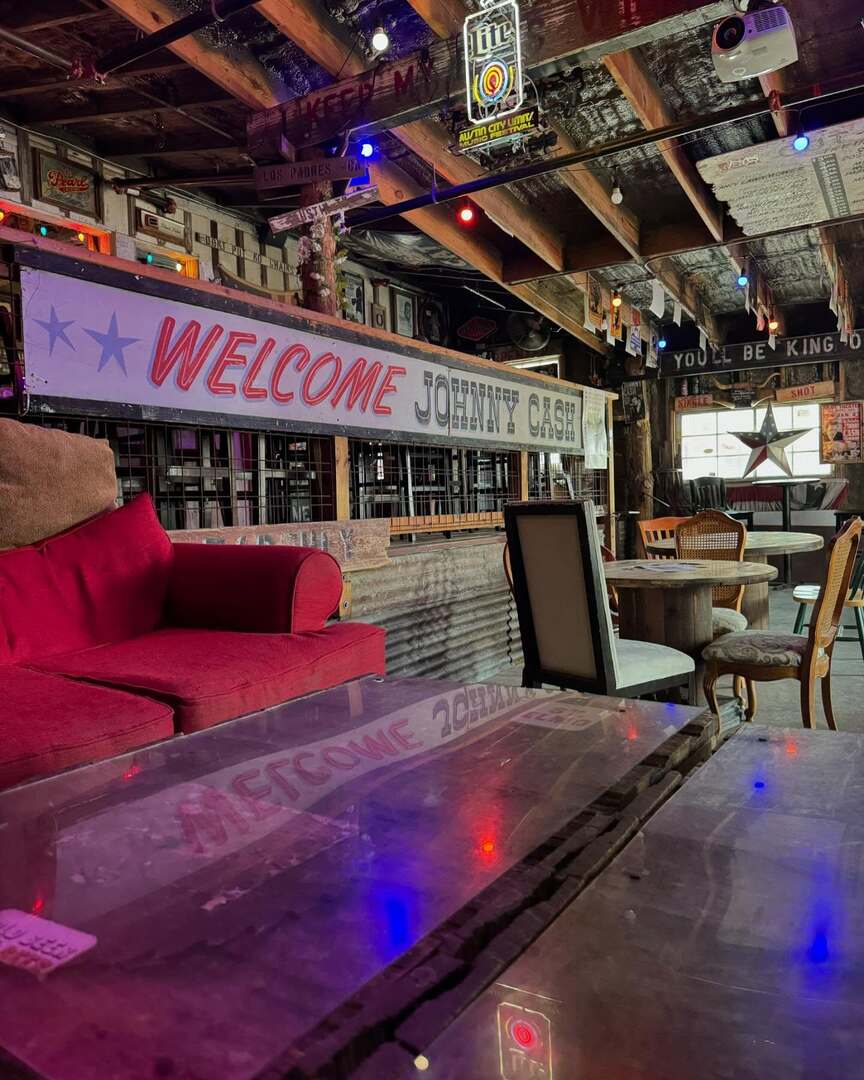 Mean Eyed Cat has humble beginnings as the space once served as a chainsaw repair shop in a small outbuilding on the edge of Clarksville. As the neighborhood built up around it, the bar kept its well worn charm with a rustic and nostalgic interior adorned with chainsaws and memorabilia in celebration of the man in black himself– Johnny Cash. Named after a famed Cash song, Mean Eyed Cat is festooned with portraits, posters, and song lyrics. Featuring an excellent draft selection of local and craft beers in addition to a creative cocktail list, patrons can enjoy the interior space – a homage to the great Johnny Cash – or the open wood patio sheltered under an immense 300+ year old Texas Live Oak.