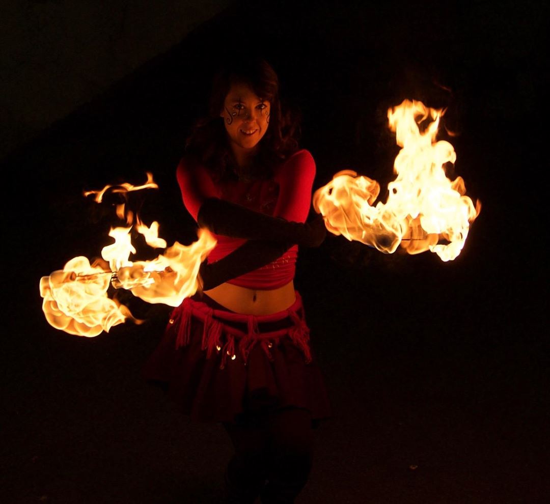 Fire shows can include spinning flaming poi balls, dancing with fire fans, palm torch dancing, fire rope spinning (Snake Poi) and fire eating!