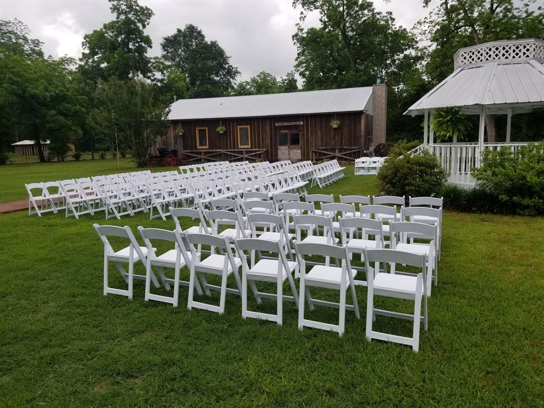 Inside tables and chairs come with the price of renting Autauga Place. We have table clothes to match any color you need and anything else you need for your event on site.