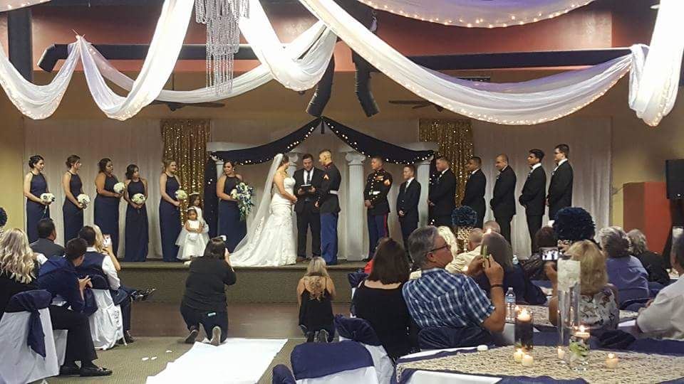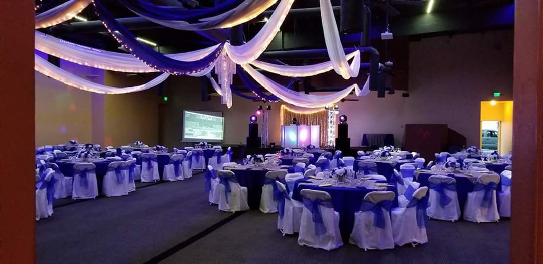 Special Features: Capacity of 398 60 inch round tables White folding chairs LED and Dance floor lighting Raised stage over-looking the dance floor DJ Booth with a full sound board and surround sounds speakers Full prep kitchen Ice machine