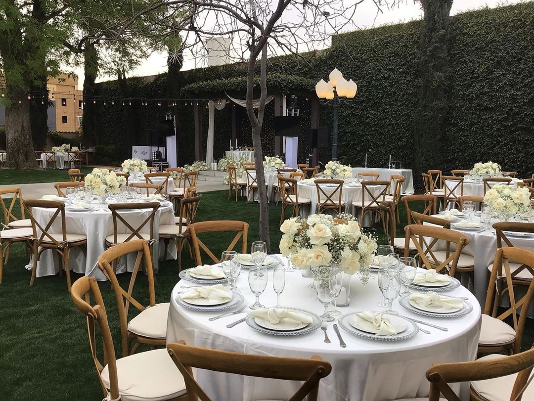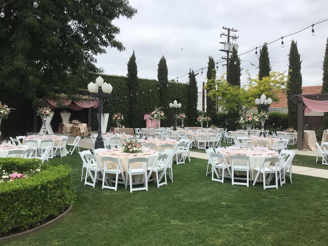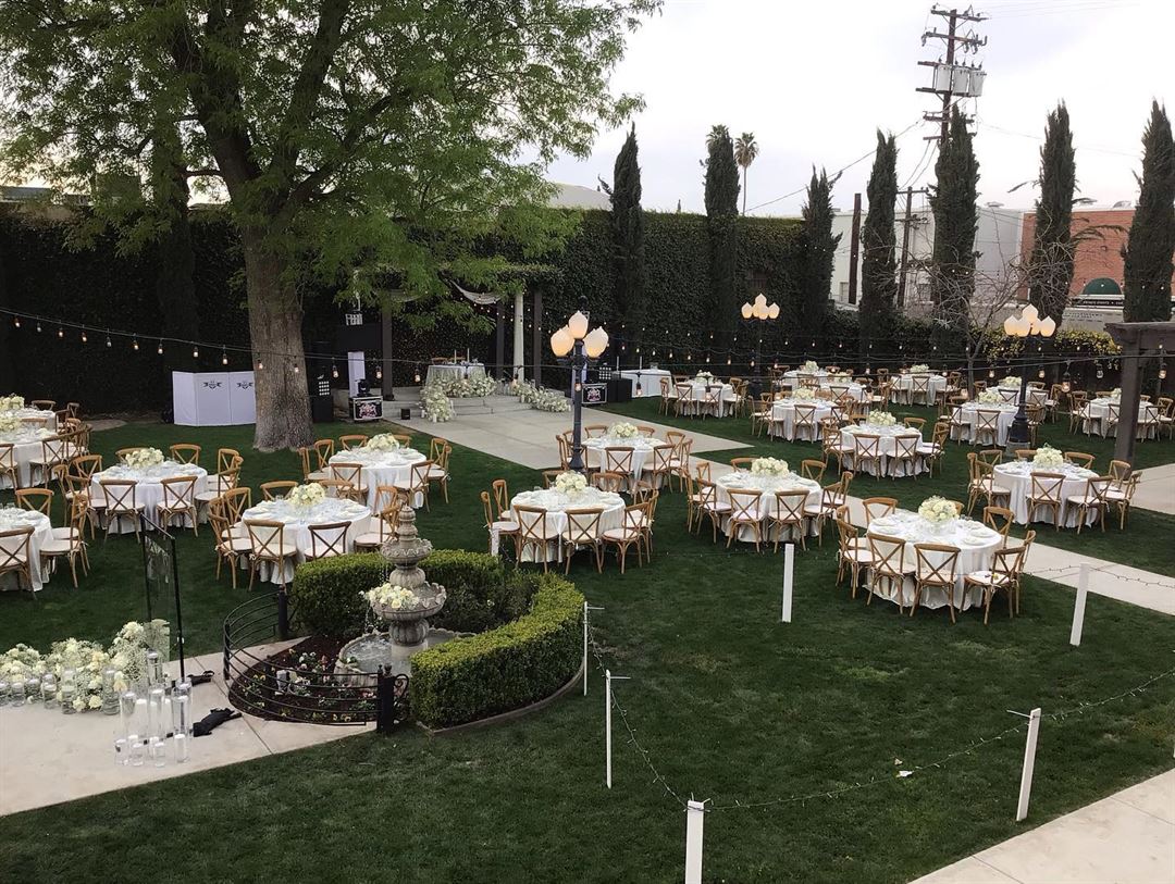 A secret garden in the center of the city! Beautiful garden with Italian wedding lights, fountain, dance floor, trellis covered stage, trellis covered bar-food serving area.