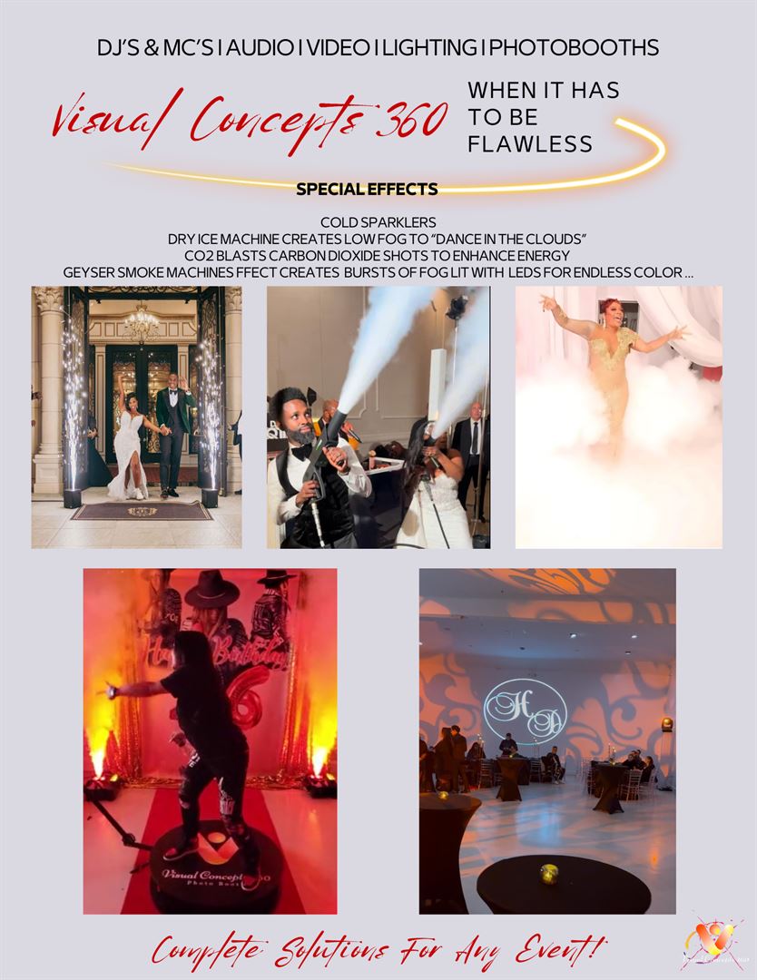 Complete solutions for any event! Photobooth’s, DJ’s, MC’s, Audio, Video, & Lighting! In addition, we also specialize in special effects. Ground fog, Sparklers, CO2 Cannons, Geysers, just to name a few. Give us a call and lets get you booked!