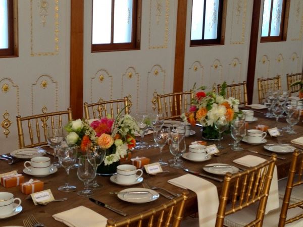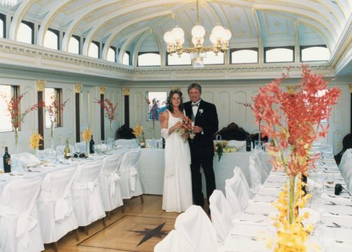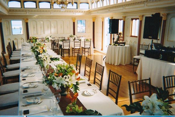 The Cabin consists of a large room and two small staterooms. Its plain exterior belies the ornate and regal appointments inside. This place is impressive. The walls and arched ceiling are panels of elaborately decorated wood that have been painted a crisp white and highlighted with gold leaf. Along the sides of the Cabin are a series of small, delicately etched glass windows; handsome crystal chandeliers hang at each end of the room. The Cabin also has decks on three sides that have wonderful views of the San Francisco skyline and of the colorful boats berthed at the nearby yacht harbor. The China Cabin offers a glimpse of old-world elegance and attention to detail; the result is a rich, sophisticated appearance that makes this a unique setting for a special wedding, rehearsal dinner, meeting and private or corporate party.