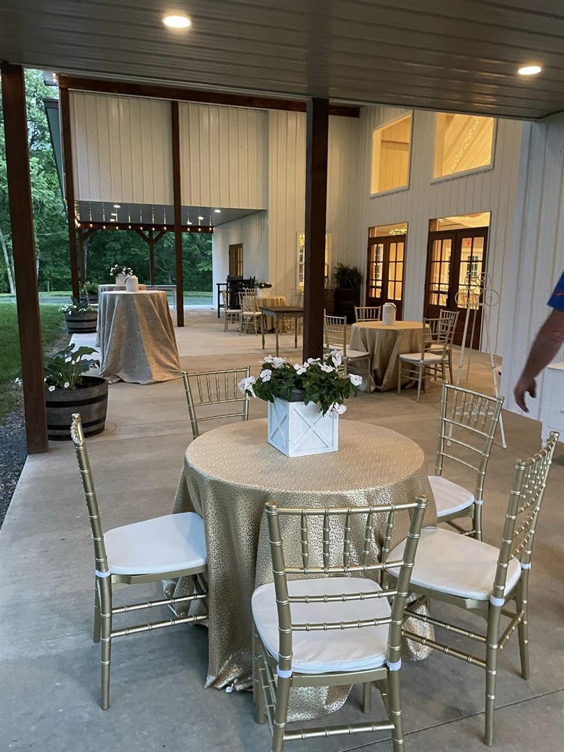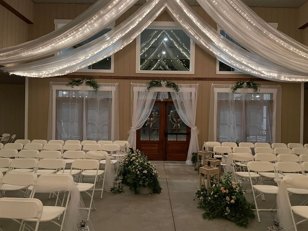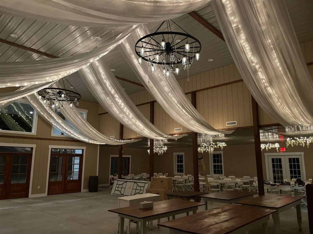 White Oak Wedding Barn is pre-decorated with white fabric and string lights that hang from the ceiling. Whether you are going for romantic, elegant, or rustic, it creates the perfect atmosphere for any wedding. The pre-hung fabric and lights make it easy to personalize without all the extra work, time, and money. Just add your wedding colors and table décor to create the wedding of your dreams.
