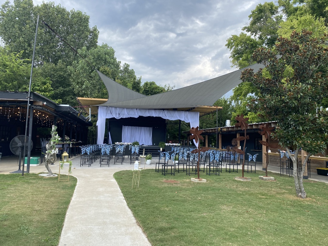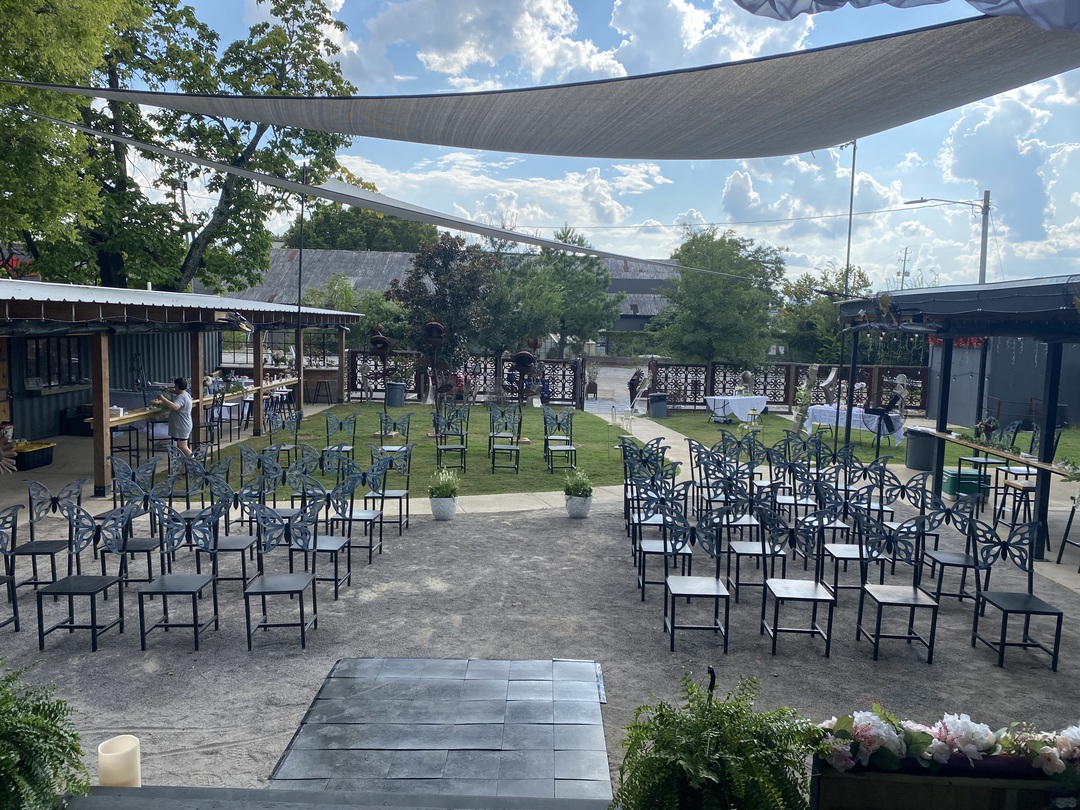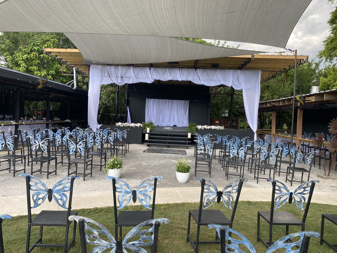 We are a giant whimsical sculpture park with the capacity of 850 in the park with a covered stage and 14 foot multimedia display system. We have an enclosed patio that can be heated for winter with small stage that can accommodate 135 people.