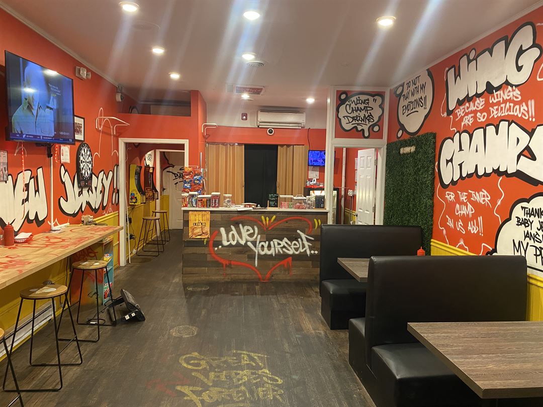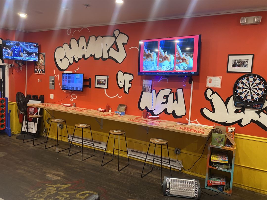Wing Champ offers a unique location with a one-of-a-kind setup. It features old-school games like Pac-Man mounted on the wall, a life-size Connect Four game, and a section for all board games to keep the family vibes alive. There are also five flat-screen TVs, a backdrop for photo-taking, and an indoor/outdoor dining area.