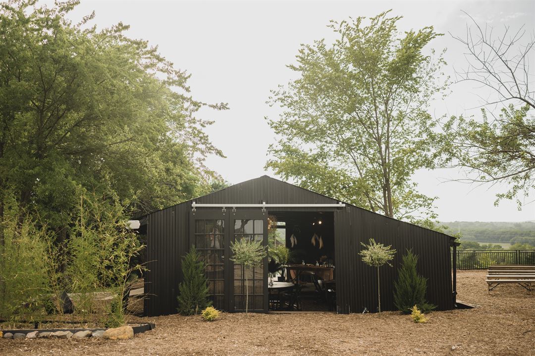 Crescent Moon Venue is an intimate, industrial-chic gathering spot in Blue Ridge, Texas comprised of two shipping containers and a historic barn amidst a backdrop of greenery and one of the best sunset views in North Texas.