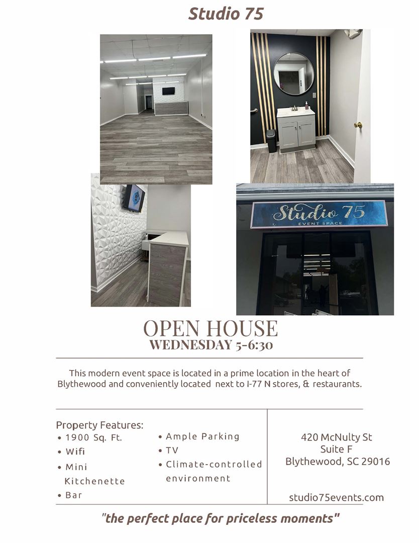 Studio 75 Event Space is the premier destination for hosting unforgettable events in Blythewood, SC. Our state-of-the-art venue is meticulously designed to offer elegance, sophistication, and versatility to bring your event vision to life. Whether you’re planning a wedding, corporate gathering, or private celebration. Studio 75 provides a blank canvas where your unique ideas can flourish.