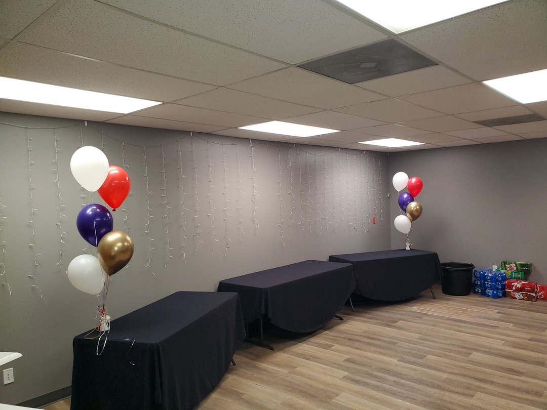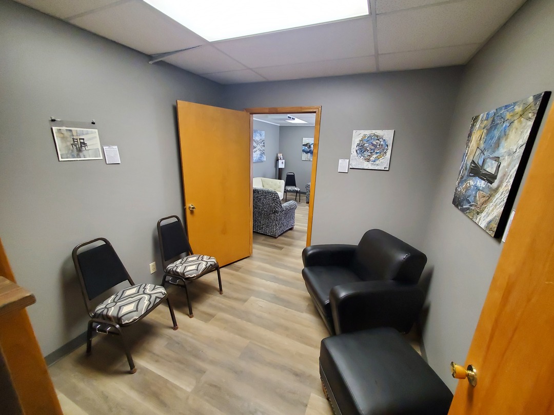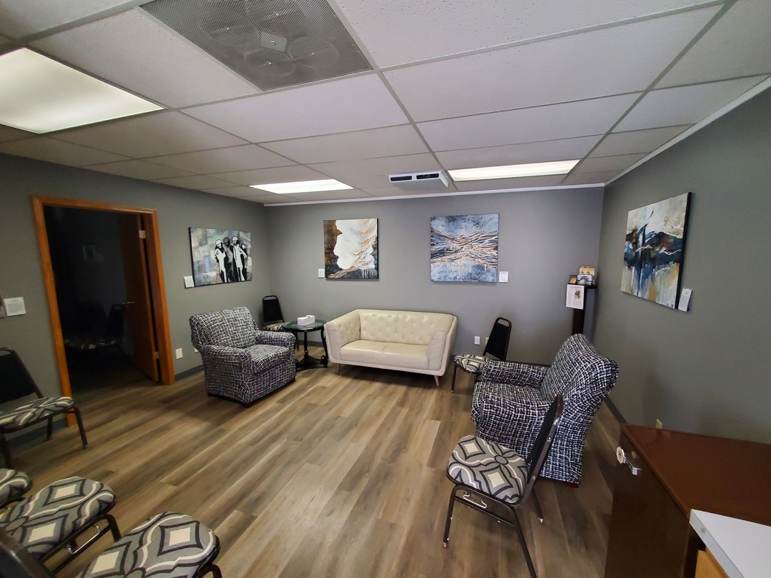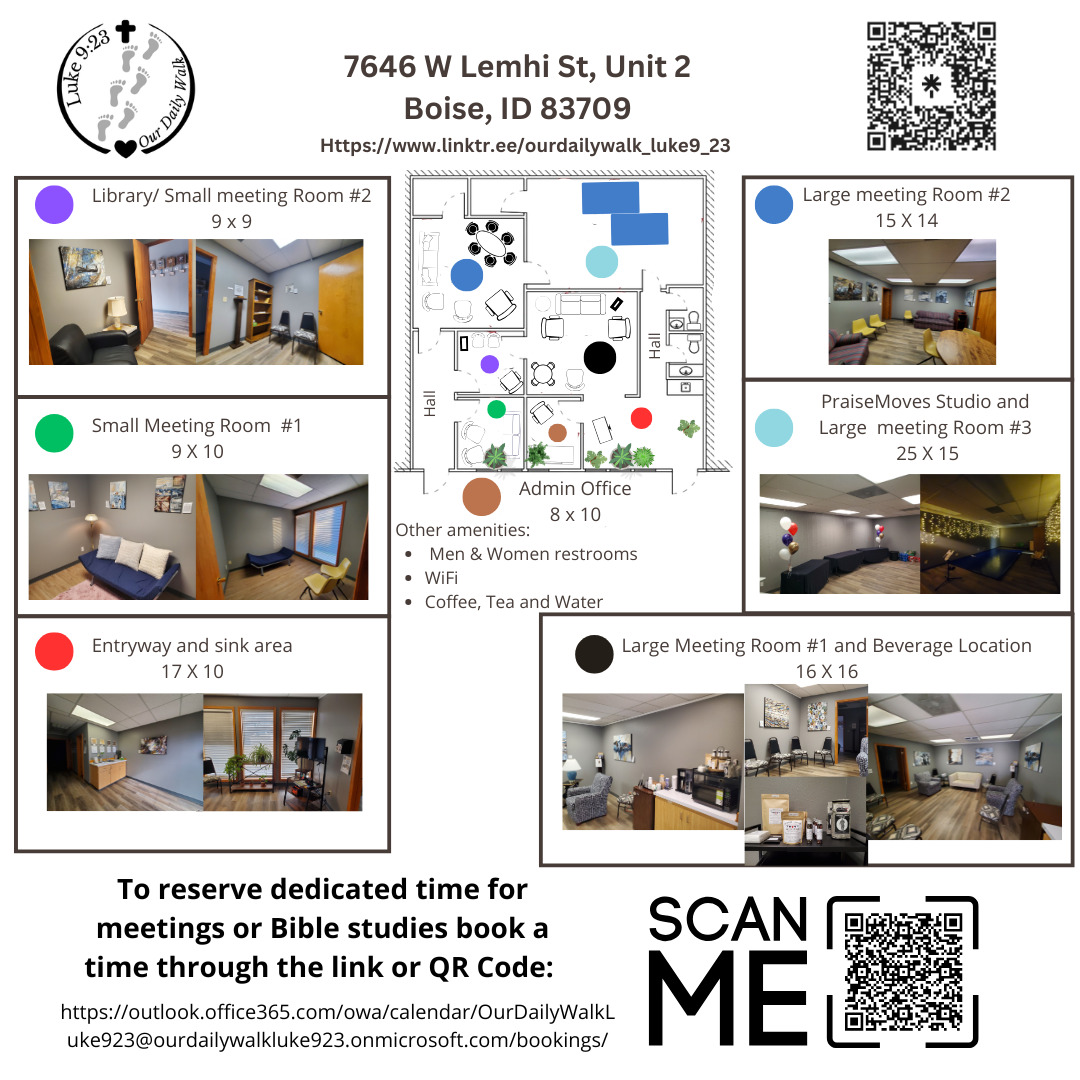A faith-based meeting place. One large, two medium, and two small rooms for group meetings. No kitchen, but a sink, refrigerator, and a coffee/tea bar.