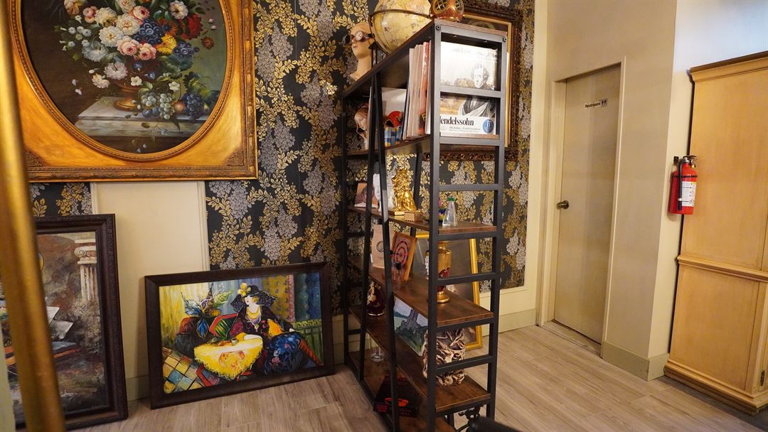 As you enter the space, you'll be greeted by warm lighting and comfortable seating, which create a cozy atmosphere. The walls are adorned with beautiful artwork and decorative accents that add to the ambiance. The space features a cafe kitchen, a large island fixture for seating/demonstrations, window bar seating, bench seating, a bistro set, an antique couch, and a restroom.