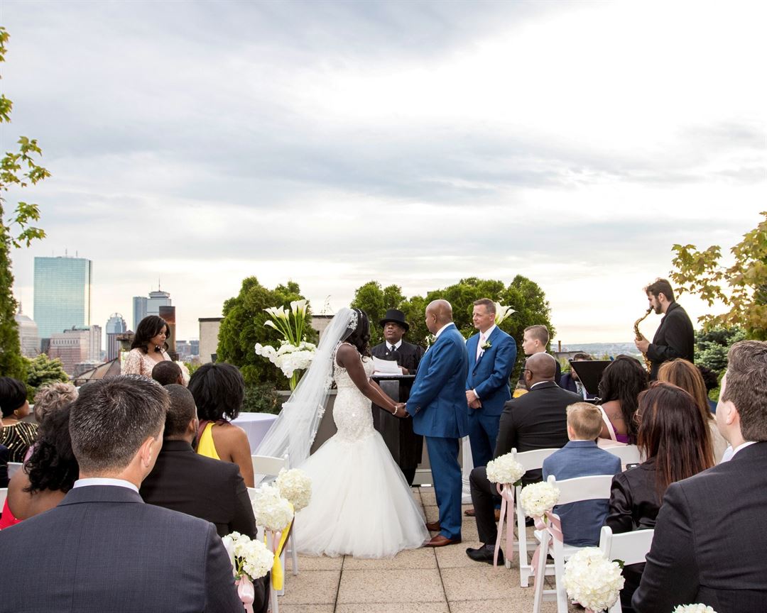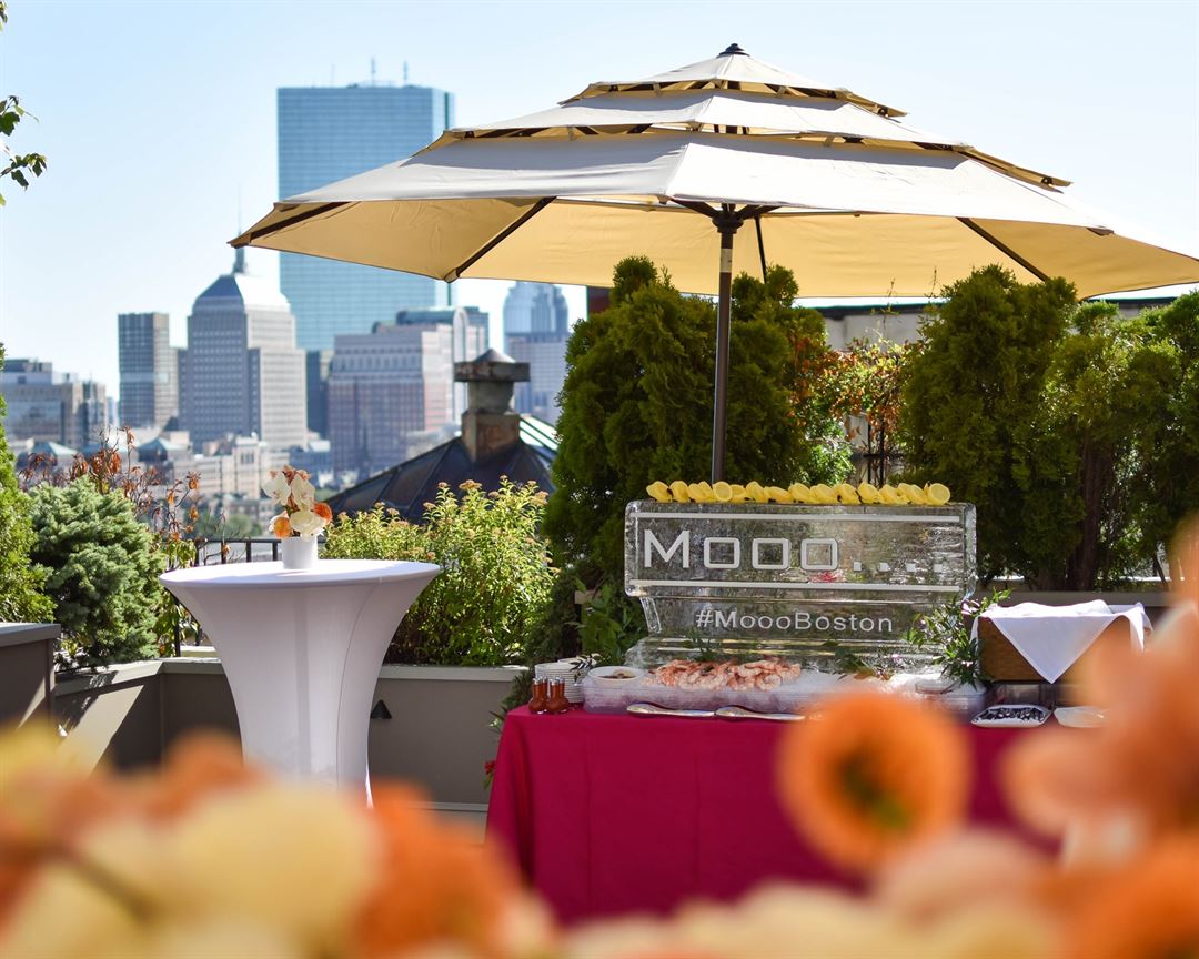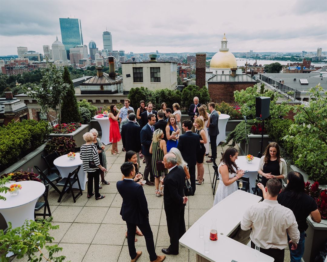 During the summer, the Roof Deck at XV Beacon provides unrestricted views of Boston’s skyline for cocktail parties and wedding ceremonies.