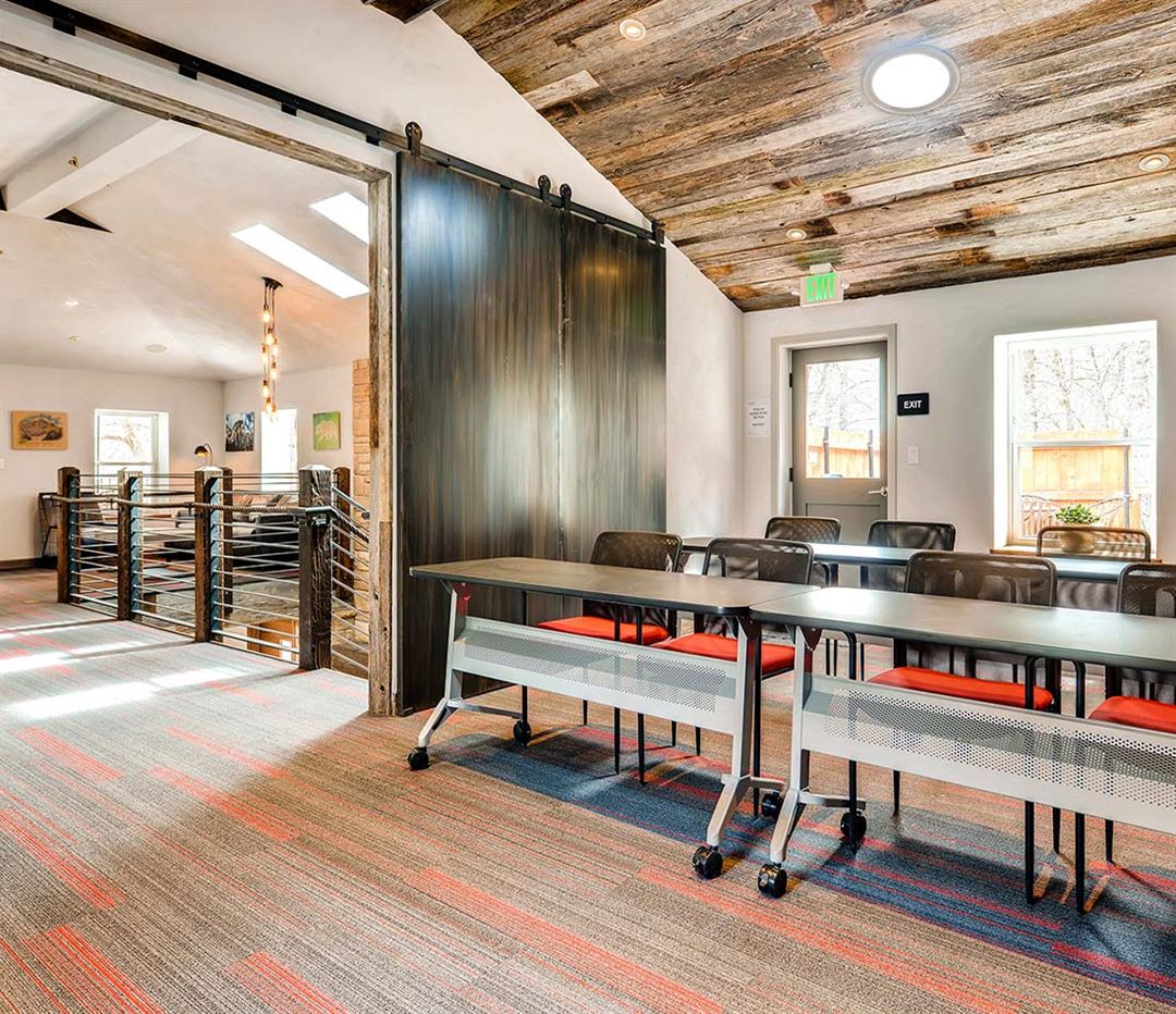 Our second event space is The private meeting room can hold up to 20 people. If you need more space, the entire upstairs opens up through a 7 foot barn door and more than doubles the size of the venue! This option also includes the exterior balcony and private patio. Great for holiday parties, retreats, and events under 50 people.