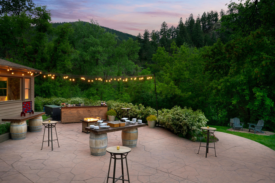 Choose from two breathtaking outdoor ceremony sites located in the heart of the forested canyon. The main site features a manicured lawn and a natural arch adorned with earthy stonework and wood beams, surrounded by towering pines. For a more intimate gathering, descend the stone stairs to the creekside spot, where a white-wood arch and the sun-kissed creek create a magical woodland ambiance.
