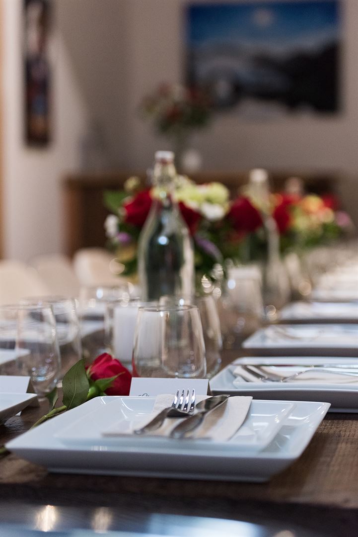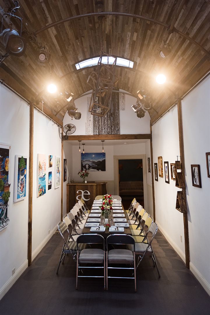 Featuring a compact kitchen, 22-piece full dinner service, redwood banquet table, seating and staging areas, 350 ft. vaulted gallery, a custom-made redwood & steel bar and comfortable lounge area, we can accommodate wedding rehearsal dinners, off-site meetings, private parties, music practices, photo shoots, pop-up dining events and many more. A host can be available to help you with your private event to ensure you enjoy what will undoubtedly be a memorable time.