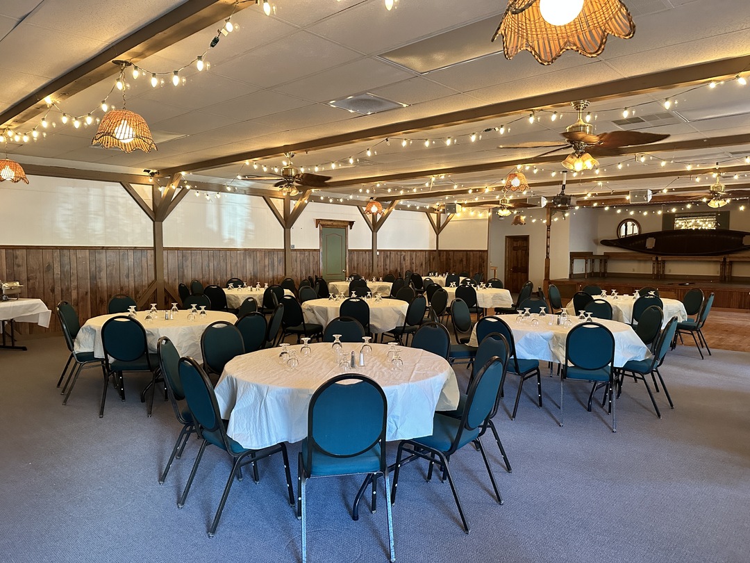 Restaurant and full bar with large banquet area. Banquet area has a dance floor and a stage with neutral decor. We also have an outside cabana style bar with patio available for events. Situated on a stunning creek side property with a large lawn and outside stage.