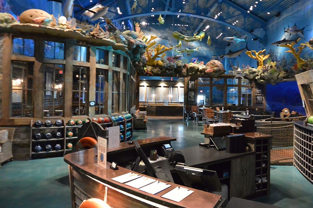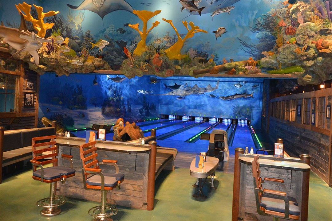 An island-theme bar area, offers visitors the experience of feeling like they are underwater exploring the skeletal remains of a sunken ship. Looking up, visitors can see the battered, barnacle and coral-encrusted wooden hull, an old rusted iron chain and the iron rail around the bow. A host of exotic fish swim in and around the wreck while Dorado and sharks, suspended from the ceiling, appear to swim overhead. The bar features a huge saltwater aquarium with scores of beautiful, tropical fish. It is elevated to provide views of the bowling action while serving up your favorite refreshment.