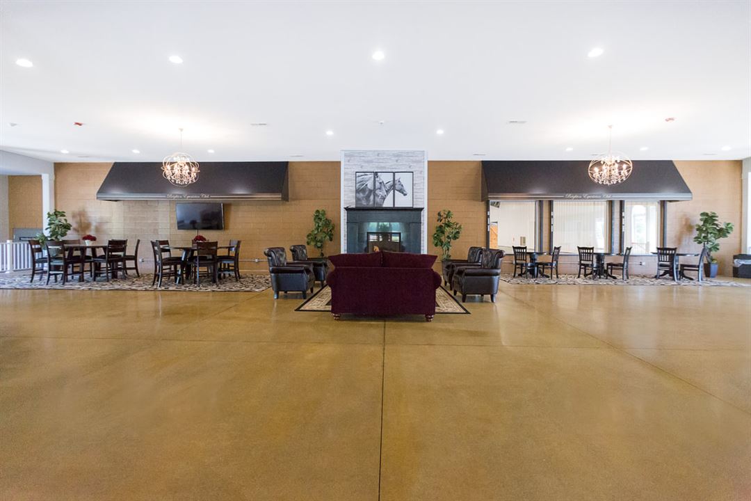 The main club room has high-speed internet connection, a large screen LED display, a fireplace with comfortable seating and can easily accommodate groups up to 99. Large observation windows located in the main gathering room look overlook the indoor arena providing a true equestrian atmosphere as the horses may be taking their daily workouts during the time your event is scheduled.