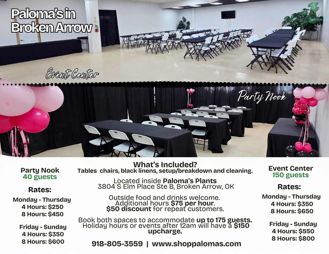 Paloma’s offers two beautiful event spaces to fit your celebration perfectly. Choose our Main Event Center, accommodating up to 150 guests, ideal for larger gatherings and milestone events. Or select our Party Nook, seating up to 40 guests, perfect for intimate celebrations, workshops, and budget-friendly events.
