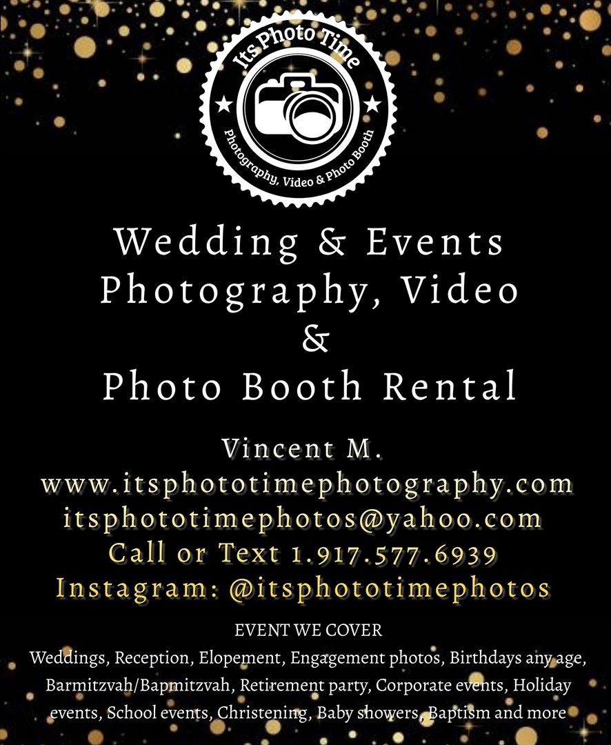 ItsPhotoTime Photography strive to provide excellent service to our clients. We are experience and provide superior PHOTOGRAPHY, VIDEO, PHOTO BOOTH, 360 PHOTO BOOTH & RING LIGHT PHOTO BOOTH RENTAL. at an affordable rate. All services can be booked separately or together. Events we cover: Weddings, Sweet 16s, Receptions, Holiday Parties, Proms, Baptisms, Bar Mitzvah, Graduation, Birthday Party & More..