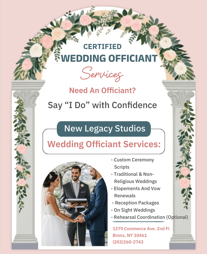 Looking to say “I do” in a stylish, private setting? We now offer ordained minister services right from our studio in the Bronx. Whether you’re planning a simple signing ceremony, intimate elopement, or a staged wedding shoot, our space and certified officiant are here to make it official.