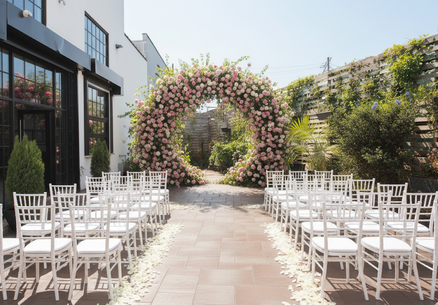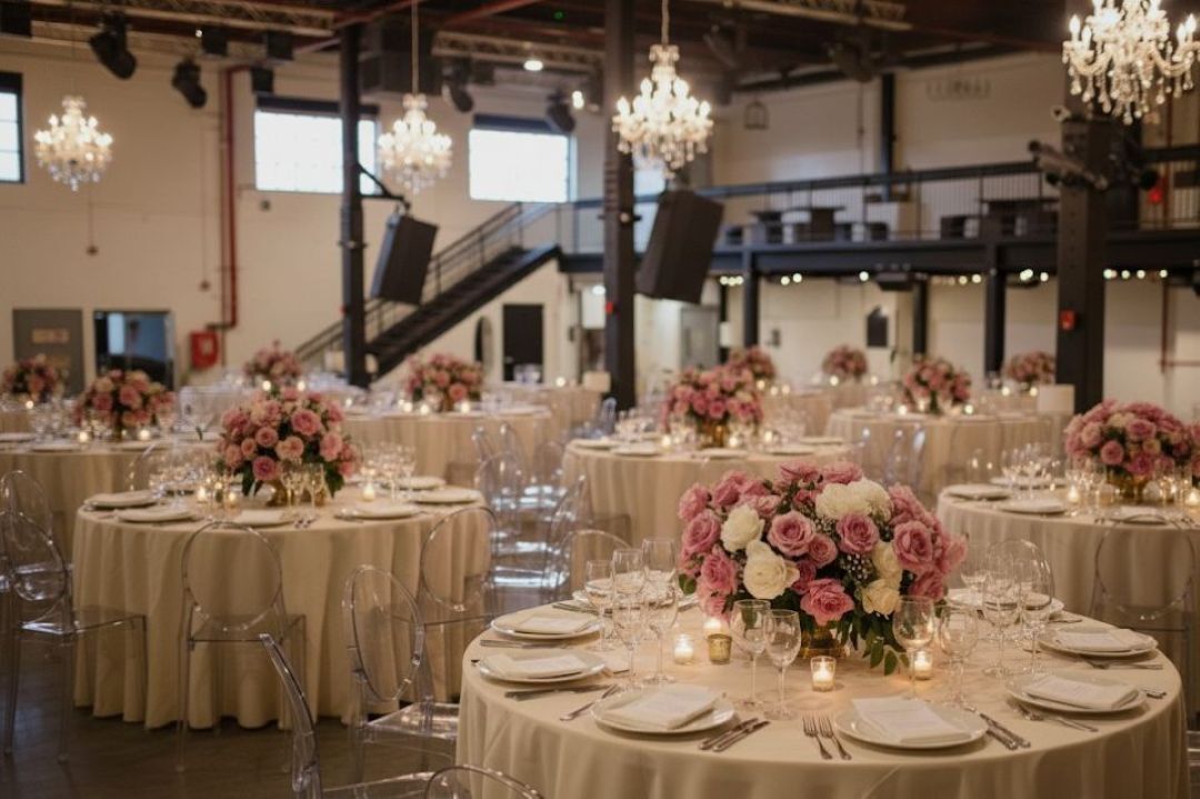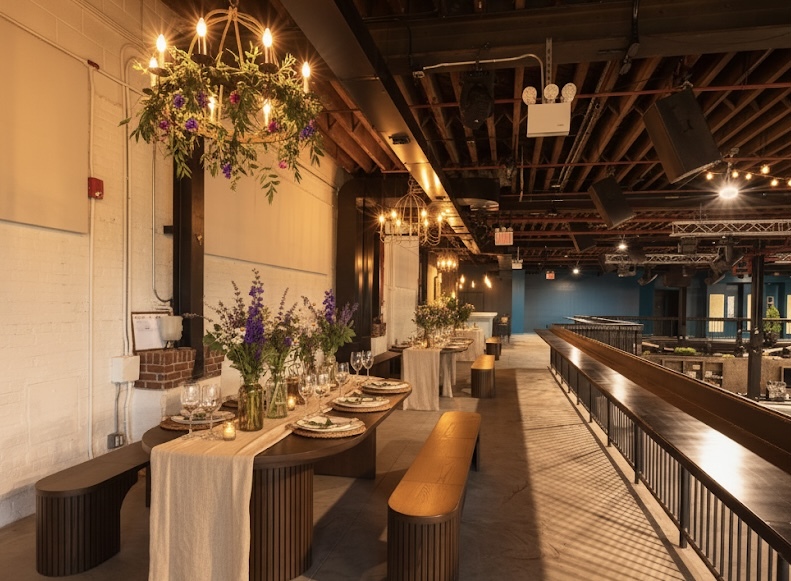 Brooklyn Roots Collective is a stunning indoor-outdoor sustainably restored former paper factory features soaring ceilings, natural light streaming through paned windows, and doors that open into a private outdoor sanctuary. Couples can exchange vows in the intimate garden, surrounded by lush greenery and upcycled structures. Inside, the expansive first-floor hall offers an open-plan layout for dinner, dancing, and live entertainment. Industrial-chic details, potted plants, and naturally sourced sustainable elements set a stylish backdrop, while a built-in stage can host bands, DJs, or performers. A mezzanine level adds depth and dimension, complete with a VIP bar and lounge seating. Guests can also enjoy the outdoor courtyard for fresh air and conversation throughout the festivities. With flexible indoor and outdoor settings, Brooklyn Roots Collective accommodates weddings of varying sizes and styles. We can easily accommodate BIG weddings—there’s no need to limit your guest list.