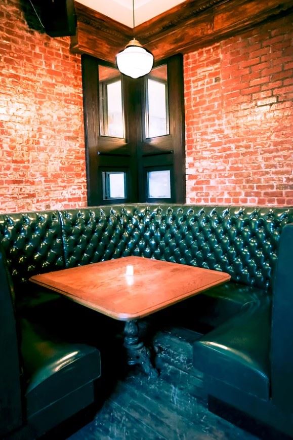 The event space has intimate banquet booths, a large floor space, skylight, exposed brick walls, another antique mural and hand carved molding. Equipped with a separate sound system, TVs, big screen projector, P/A system, dance floor.