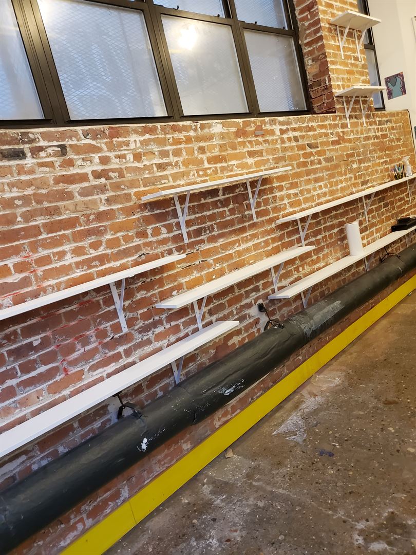 Modern art studio in a great building in Bushwick. Brick accent walls with amazing lighting. Small but sweet for intimate events or displays and photoshoots. Shelves available for item display.