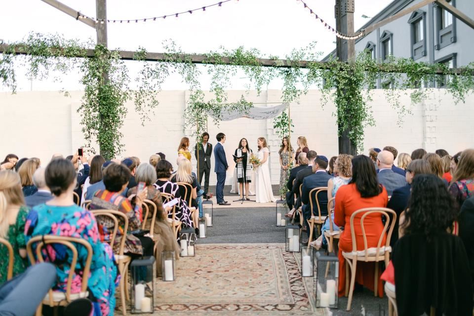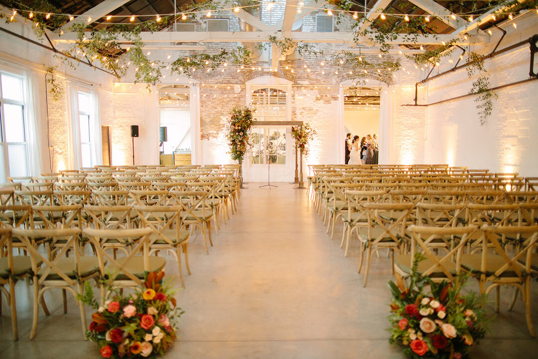 Our venue offers 6,000 square feet of wide open indoor space. Architectural highlights include original brick walls, vaulted ceilings framed by reclaimed wood trusses, skylights sprinkled throughout the building, and glass doors for natural light. Our main room can adapt to the ceremony and reception alike, with a maximum capacity of 300 people standing and up to 150 people seated comfortably. Just off the main room is the cocktail lounge, which boasts a reclaimed 20-foot mahogany bar and accommodates 150 people standing or 60 people seated. Tucked past our cocktail lounge are two private suites where you and your partner can get ready for your big day. Meanwhile, our 6,000 square foot courtyard is just outside the main doors of our inside area. It allows for your wedding festivities to extend outdoors. Alternatively, it can be used as parking for special wedding party transportation.