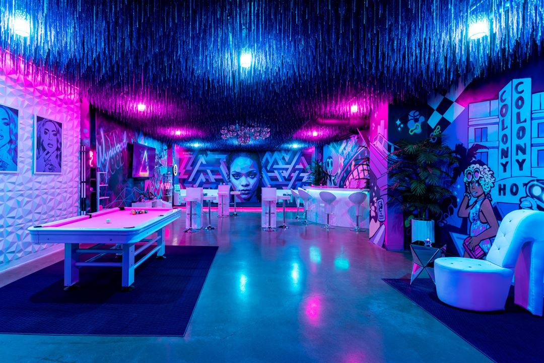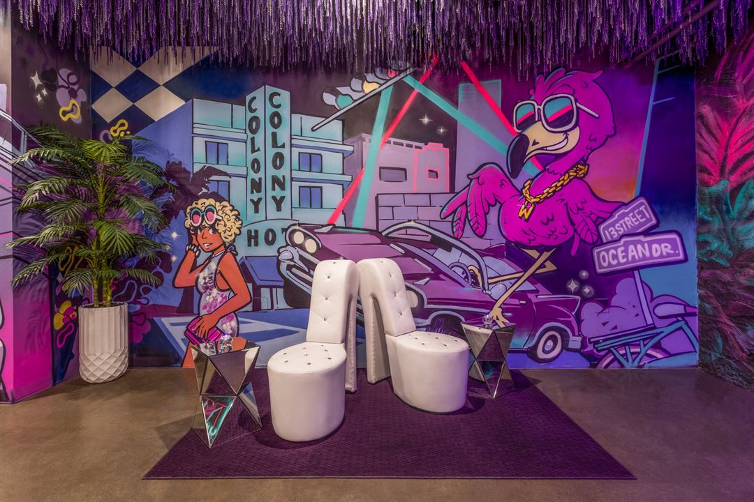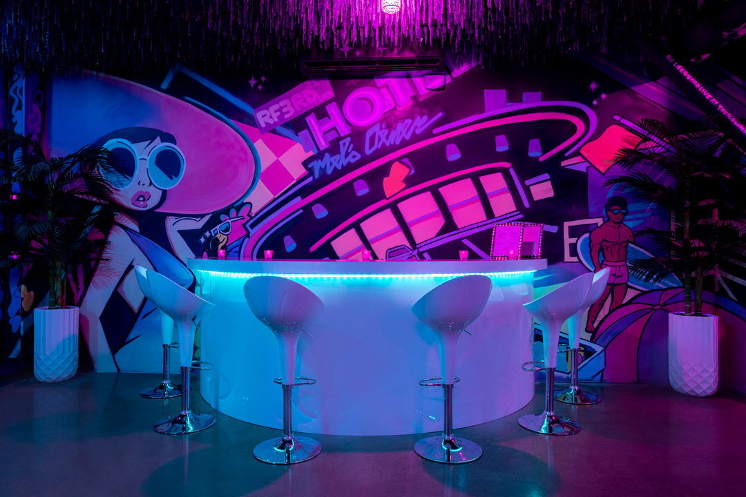 Tucked away in edgy and increasingly hip Bushwick renowned for its converted warehouses and abundance of street art, Wynwood private lounge fits right in. Named after the thriving art-focused district of Miami, the venue is heavily influenced by the sights, colors, and glamour of the city’s 80s-era. Wynwood visually immerses you in nostalgia with its sparkly white leather furnishing, zingy neon lights, posh disco attributes that create an incredibly inviting ambiance. Meanwhile bold graphic shapes, crazy patterns, intentional asymmetry, elements of pop-art and striking color combinations embody the creative & artistic feel the revitalized neighborhood of Miami is famous for. Combining the pleasant retro vibe with vibrant custom murals splashed on walls top to bottom, Wynwood lounge is truly an exquisite place that transports you somewhere else while remaining a quintessentially Bushwick venue.