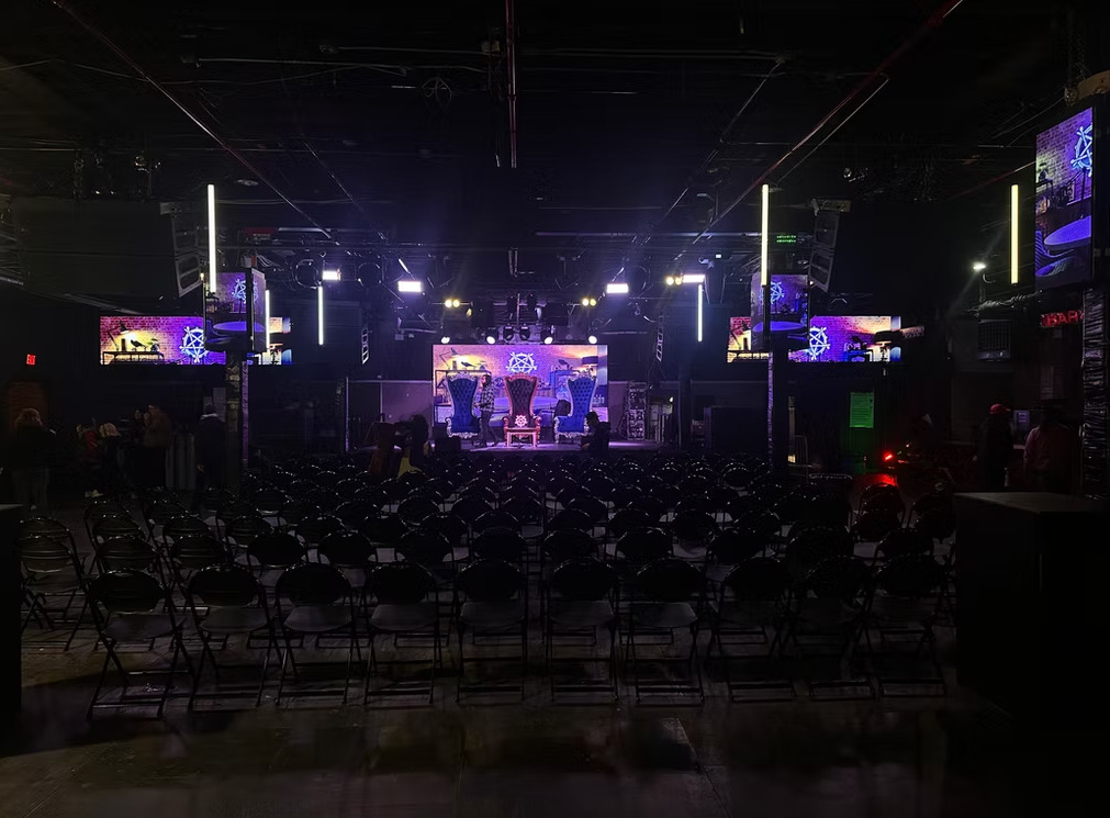 Large indoor stage with video wall, full sound and light system available for use.